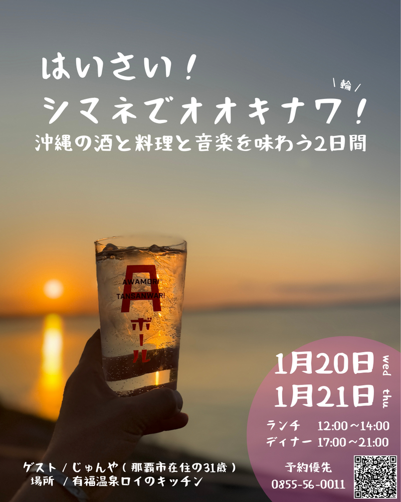はいさい!シマネでオオキナワ!(輪) SCHEDULE 2026/01/20(火) - 2026/01/21(水) ロイのキッチン 地図を表示 ※営業時間は予定となります。延長は覚悟しております。 ※食材調達によるメニュー変更の場合があります。ご了承ください。 ご予約はこちらから! URLをコピーする 報告する